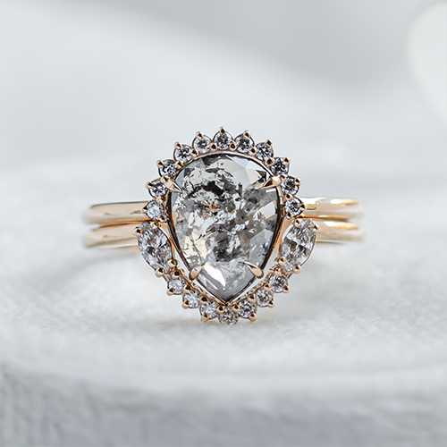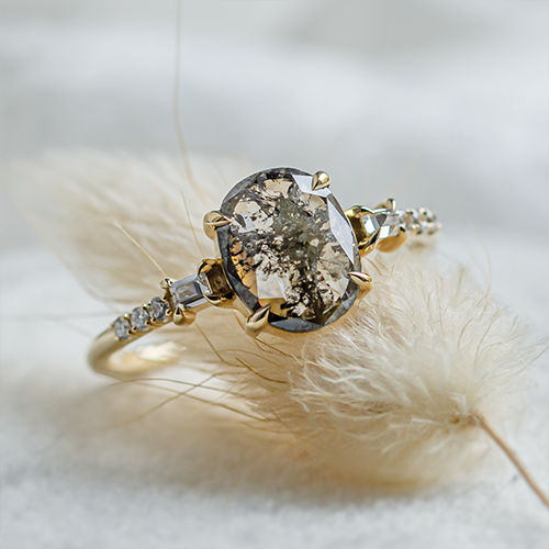 The tiny inclusions make each piece completely unique and their frequency influences the resulting colour. This can range from smoky grey to almost black, which in combination with the clear diamond resembles a starry sky. It's no wonder that salt and pepper are an increasingly common choice for an unconventional engagement ring.