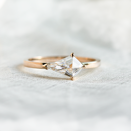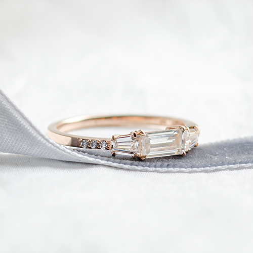 We use clear, sparkling moissanite crystals in all possible shapes in our jewellery workshop. Fans of traditional engagement rings and the straight, modern lines of the Butterfly ring, for example, will find them to their liking. For the advocates of simplicity, minimalist rings with baguette moissanites are ideal.