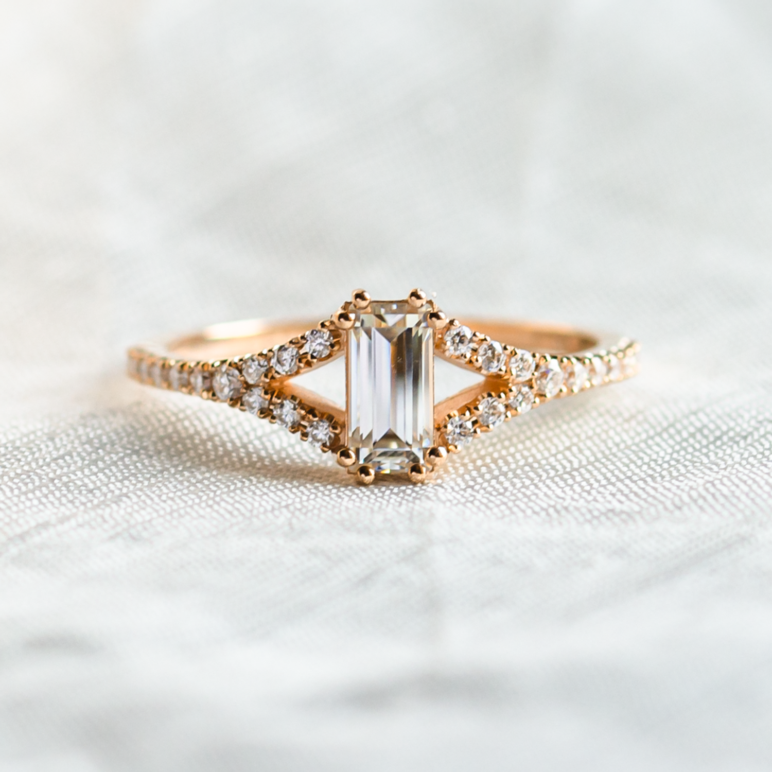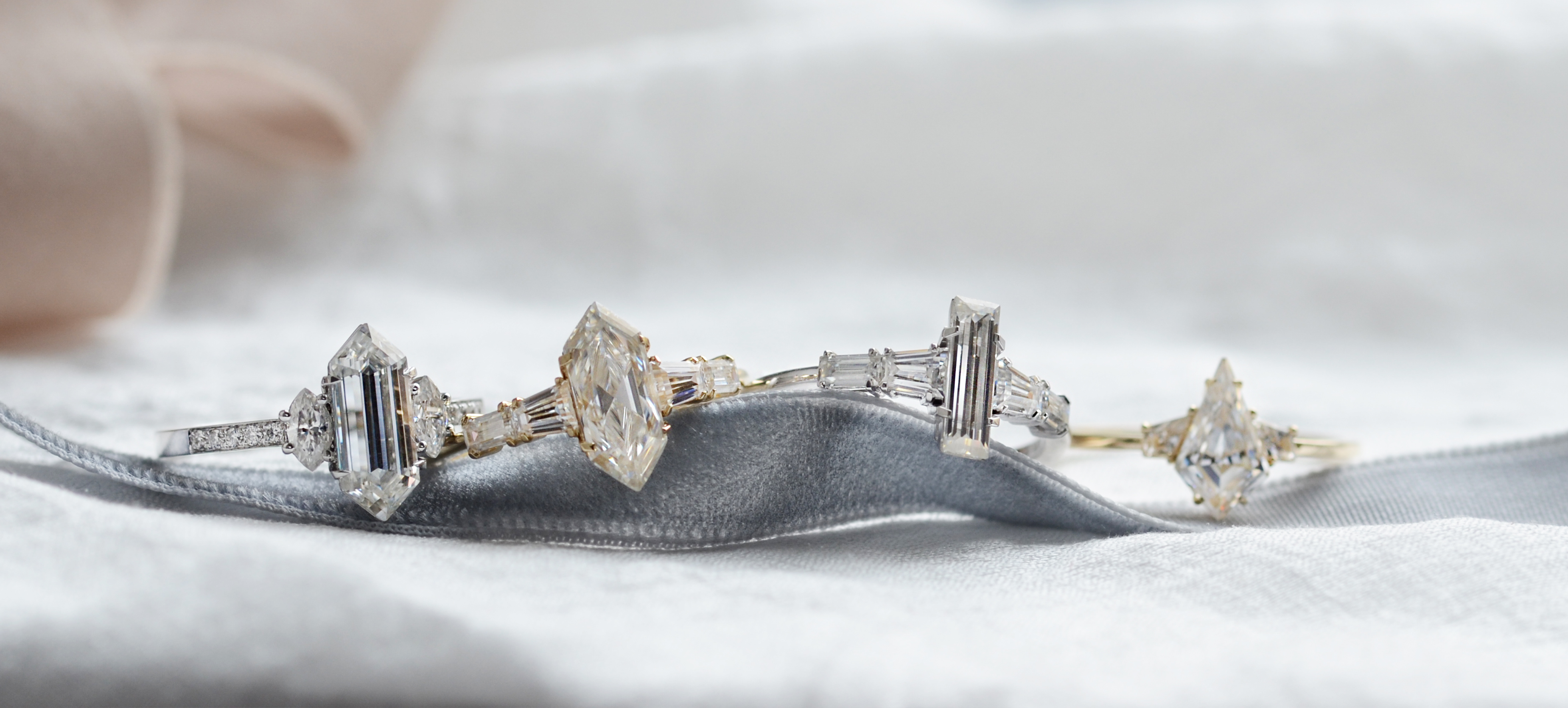 Thanks to the technology that allows mass production, moissanite is becoming increasingly popular in the jewellery industry and our jewellers also like to work with it. It is produced in different colours such as blue-green and cut into a variety of shapes. Take inspiration from the modern elongated baguette moissanite, the sharp edges of the kite type, the atypical hexagon, or the classically round shape ideal for engagement rings.