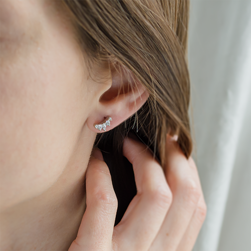 Which earrings to wear at the wedding? This is a question that almost every woman asks herself. The best thing is to match the style of your earrings with your dress, other accessories and even your hairstyle! If you have a striking necklace, a richly embellished dress or a hair down hairstyle, try a pair of minimalist studded earrings. They can complement and soften the overall look! For example, our crawler moissanite earrings are very popular with brides.