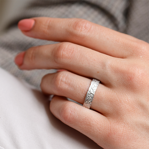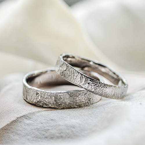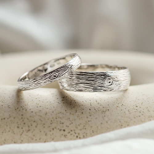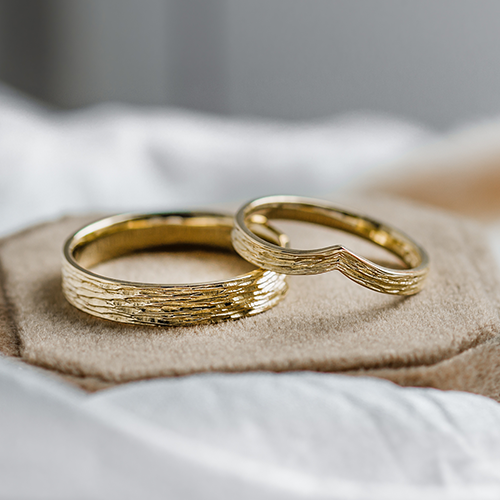 If you're planning a forest wedding or just share a love of nature, these unconventional wedding rings will win your heart. Their surface resembles tree bark or even twigs. Our jewellery designers use a special technique to achieve the desired design. It's called the lost wax method, where an alloy is poured into a mould made of durable wax, resulting in an exact duplicate of the ring you've chosen in the photo or in the showroom.
