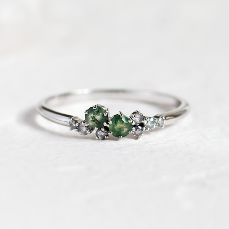 Original, elegant, stylish. These are the most descriptive words for this EVE cluster ring. Its unmistakable adornment are two moss agates, which have characteristic tiny inclusions resembling moss. So every time you look at the jewel, you can imagine looking at a different piece of nature, as the abstract patterns will absolutely captivate you. A touch of magical elegance is added by tiny salt and pepper diamonds. In addition, you can personalise the jewellery and choose any colour of gold as well as the specific shade of moss agate we currently have on offer.