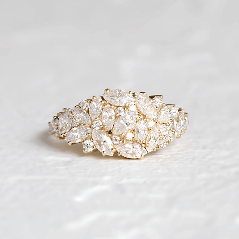Would you like to treat your loved one (or yourself) to something truly special? This gold moissanite ring with is a real treasure among jewelry. Its surface is adorned with dozens of tiny moissanites set in a cluster style, creating a perfectly sparkling mosaic. With every movement of the hand, this luxurious ring sparkles and attracts many compliments. In addition to their aesthetic appeal, the gemstones also impress with their ethical laboratory origin, making the jewelry not only beautiful but also a responsible choice. The ring is available in yellow, white, and rose gold, so choose the right one and let it shine in all its beauty.