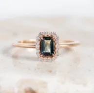 Gold ring with radiant teal sapphire and side diamonds JOY