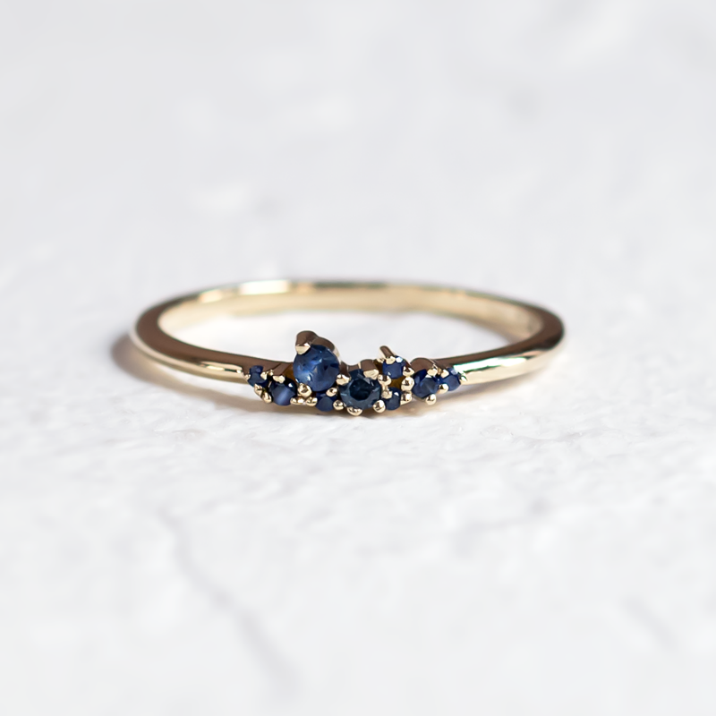 Gold ring with a cluster of blue sapphires looks tender and feminine. Definitely a go to jewelry to impress ladies with good taste in minimalist accessories. Dark blue sapphires are very classy and make each jewel an elegant thing. Noble sapphire is a gemstone for conscious women that appreciate the originality and precise design.