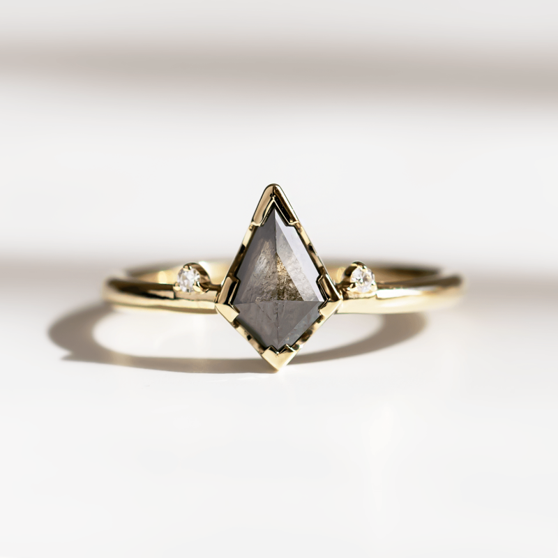 An alternative engagement ring that will take your breath away. Although it is a ring with diamonds, it does not look ornate. Our engagement ring with salt'n'pepper diamond is decorated with two more classic diamonds. The unusual kite shape of a diamond can lengthen a finger beautifully. We love alternative jewelry, so we created another engagement ring that will appeal to a woman with refined taste. We produce all our jewelry in the center of Prague and in all colors of gold. What color will you choose?
