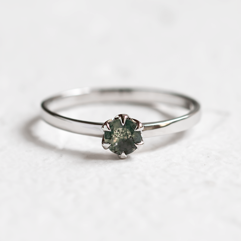 The minimalist moss agate ring is a midway classic. Its design with one stone ranks among solitaire engagement rings. But thanks to the green moss agate, it takes on a completely unconventional character. Ask her to marry you with an alternative ring. If your sweetheart loves nature, walks in the forest or elf themes, you will definitely hear the longed-for YES! We make the ring in all colors of gold.