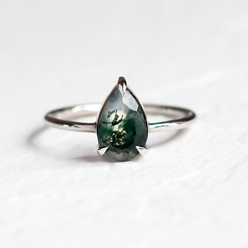 Minimalistický zásnubní prsten s mechovým achátem je na první pohled něco úplně jiného, než jste u šperků zvyklí. Mechový achát vás totiž okouzlí svou barvou a rozmanitostí. Ani jeden kámen není stejný, neboť je přírodního původu a zelené inkluze jsou vždy odlišné. Rádi vám dáme na výběr. Prsten ve tvaru kapky navíc opticky prodlužuje prsty. Vyberte prsten jako zásnubní pro vaši vílu, bohyni. Zlatý prstýnek vyrábíme ve všech barvách zlata. Všechny mechové acháty jsou přírodní a mají svůj jedinečný odstín zelené. Každý kámen je ručně broušen a díky tomu se na povrchu mohou objevit viditelné viditelné inkluze.