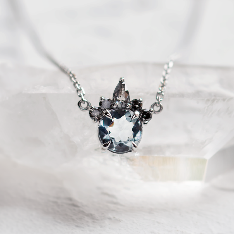 Jemný zlatý náhrdelník BELLA okouzlí kombinací ledově modrého akvamarínu a netradičních salt and pepper diamantů. Je ideální jako „něco modrého“ pro nevěstu nebo jako milý dárek pro novopečenou maminku k narození chlapečka. Nosit lze samostatně, ale nejvíce parády udělá spolu s náušnicemi ze stejné kolekce. Náhrdelník je dostupný ve žlutém, bílém i růžovém zlatě. A pokud máte raději teplejší tóny, najdete u nás také náhrdelník a náušnice s růžovými morganity a salt and pepper diamanty.